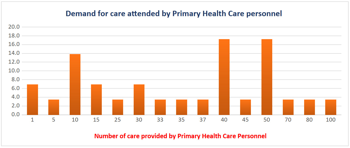 35% of the participants mentioned having one year or less of experience working in PHC, followed by 21% with 2 years of experience, and 10% with 5 years (data not shown). The professionals indicated that the demand for care at the first contact is high, with up to 80–100 consultations per week. See Figure 2.