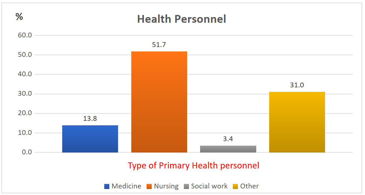 A total of 29 primary healthcare (PHC) professionals participated in the study. Of these, 17% (n = 5) were male, and 83% (n = 24) were female. The average age was 31 years, ranging from 22 to 67 years. Only 7% of participants reported speaking an indigenous language (Pame or Xi’iui). Figure 1 displays the professions of the PHC personnel, with nursing staff being the most prevalent group.