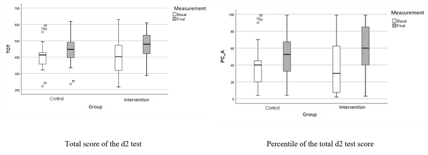 As for the total score (TOT) a statistically significant change was obtained (t= -2.9, p<0.01), the location of TOT score obtained in the corresponding percentile, also resulted with significance (t=-2.8, p<0.01) corresponding to the end of the intervention, implying an improvement in the cognitive function of selective and sustained attention of the participants. Figure 1