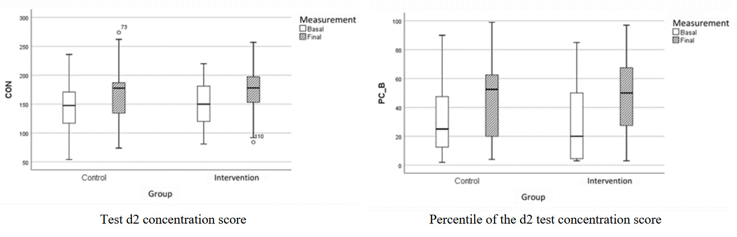 Prior to the first session and immediately after the conclusion of the total number of sessions, a test of attention Test D2 was administered, which consists of total score, concentration and variance. The total score (TOT) measures the total number of stimuli processed in the test and is a reliable measure of selective and sustained attention. The concentration variable (CON) reflects the number of relevant items correctly marked in the test, providing an index of the balance between speed and accuracy in the subjects’ performance. The variation variable (VAR) of the d2 test describes the difference between the highest and lowest productivity of the 14 lines of the test, assessing the consistency over time of the subject’s performance.17