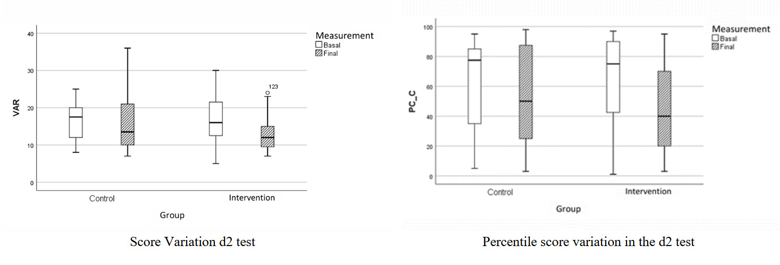 The differentials between baseline and final scores were higher in the intervention group, with no statistically significant changes in the control group. In contrast, a statistically significant increase was found in the intervention group for total score (TOT) and for variance (negative) as expected. Table 2