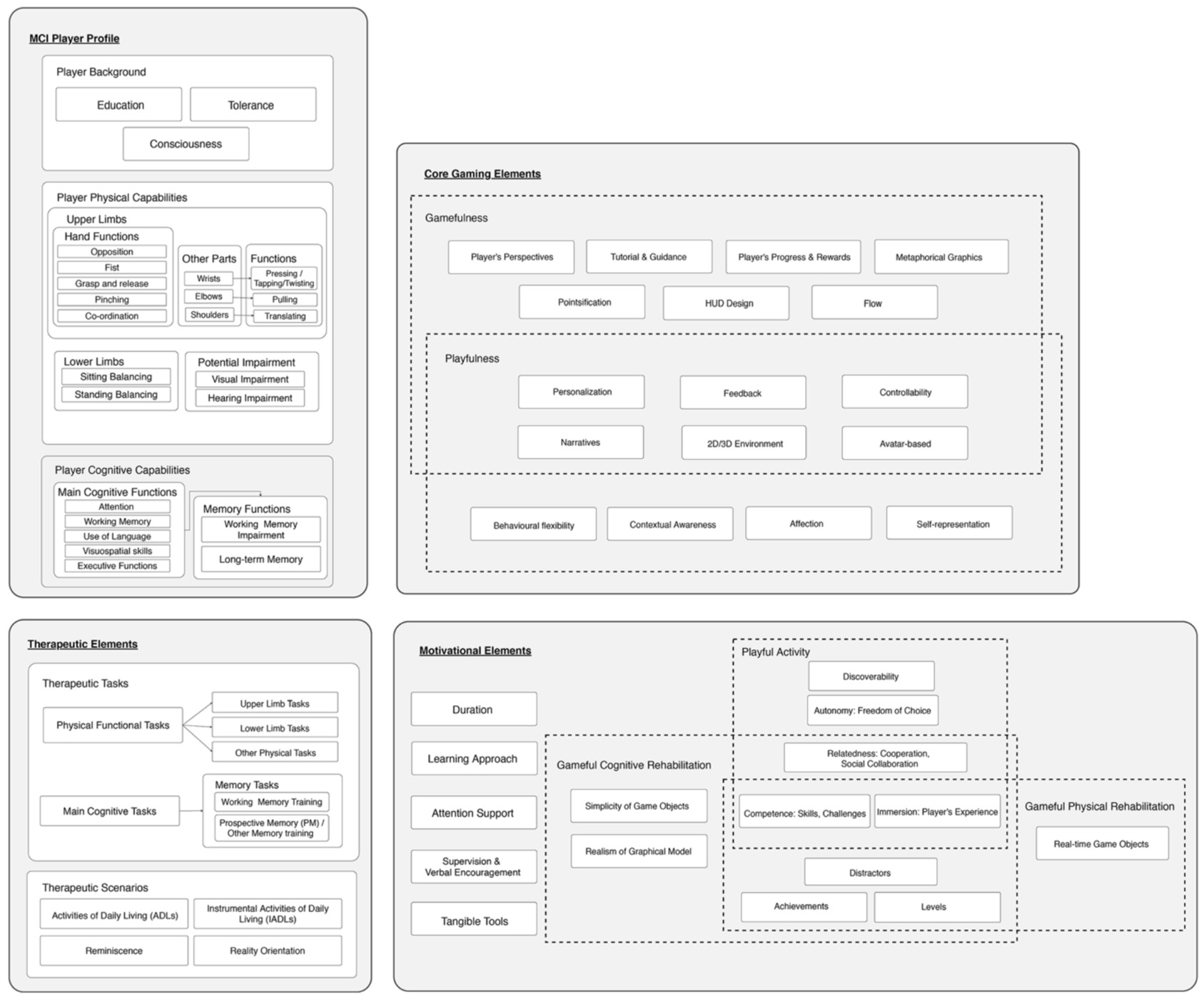 SG, one of the non-invasive tools, is envisioned to be one of the digital health technologies to mitigate the adverse impact which COVID-19 has brought to the ageing population. The aforementioned study9 has demonstrated that a framework (i.e. MCI-Game Therapy Experience) as shown in Figure 1, may be an abridged design to harness useful materials for developing a comprehensive SG for physical, cognitive and mental health enhancement for the ageing population during COVID-19. MCI is the stage beyond the normal ageing process and mostly occurs at age 65+. The authors present a tailored treatment for the elderly with MCI, which entails both physical and cognitive training contents with motivational gaming components to overcome the drawbacks of traditional intervention, such as geographical constraints, time-consuming preparation, mundane style and lack of responsiveness in therapeutic tasks.