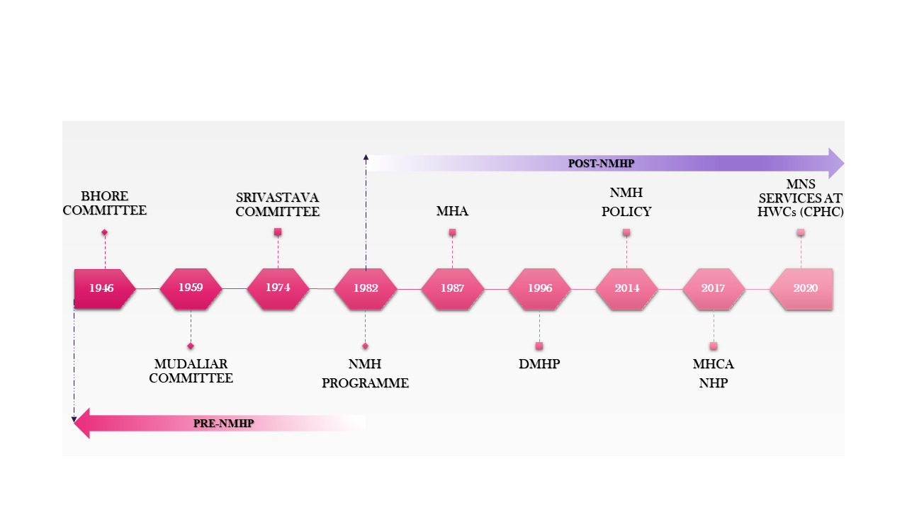 A WHO expert committee meeting on “organization of mental health services in developing countries” held in 1974, at Addis Ababa expressed serious concern over burden of mental disorders and a significant treatment gap and asserted mental health care in developing countries.10 WHO Mental Health Advisory Group (1979) initiated a formal resolution urging member countries to develop NMHP to provide mandatory mental health care through the existing healthcare system.11 India was the first major country to launch the National Mental Health Programme (NMHP) in 1982.