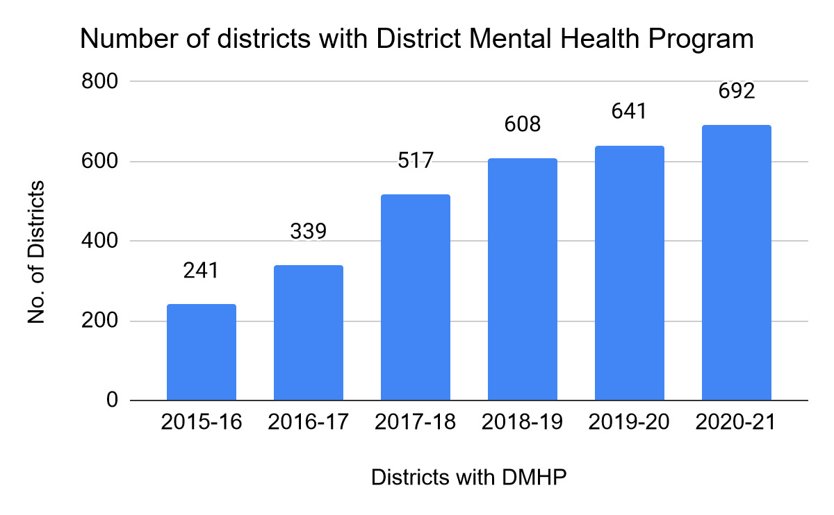 A pilot study (1985-1990) conducted in the Karnataka to assess the feasibility of districts to deliver mental health services demonstrated significant success and the potential for scale-up. Following which, the DMHP was appended to the NMHP in 1996 to overcome the shortcomings of the programme and transitioned the districts into administrative and implementation units for NMHP.11 The DMHP envisages extending mental health services through the existing healthcare infrastructure and human resources at the community level.11